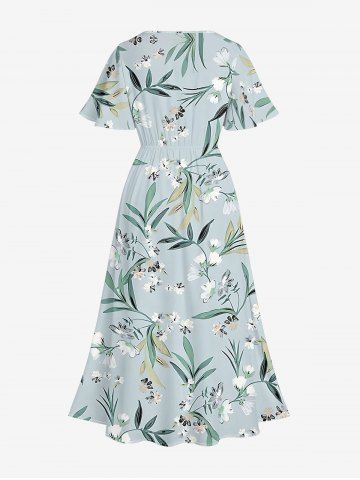 Plus Size Flowers Leaf Print Split Hawaii Midi Dress - Blue Gray - 3x