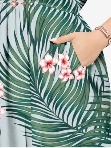 Plus Size Flowers Tropical Leaf Print Split Hawaii Midi Dress - Light Green - Xs