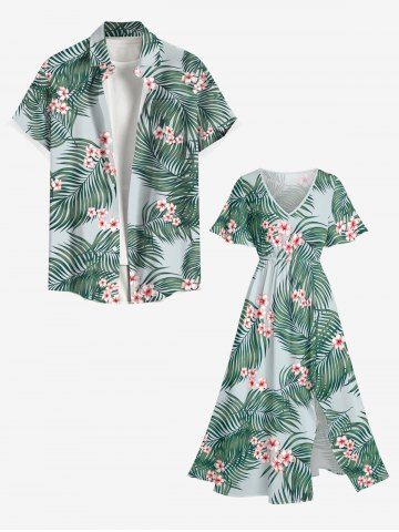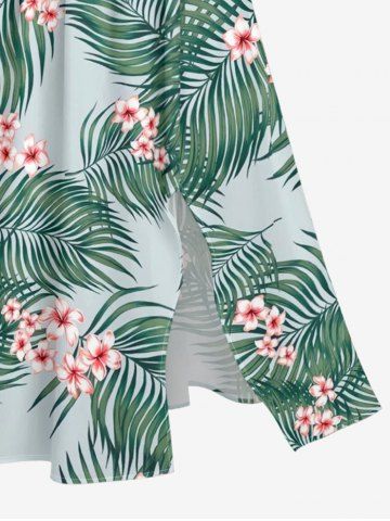 Plus Size Flowers Tropical Leaf Print Split Hawaii Midi Dress - Light Green - 2x