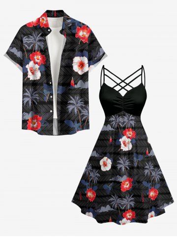 Plus Size Hibiscus Flowers Coconut Tree Print Ruched Lattice Crisscross Straps Hawaii Dress - Black - M