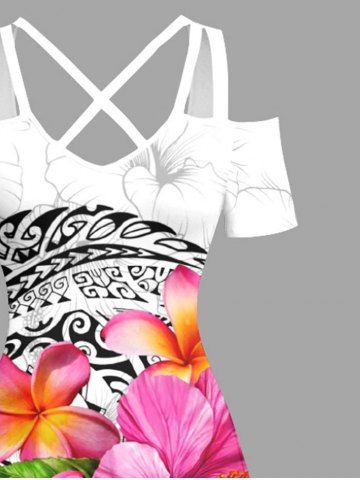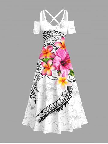 Plus Size Hibiscus Flowers Print Cold Shoulder Crisscross Hawaii Maxi Dress - White - M