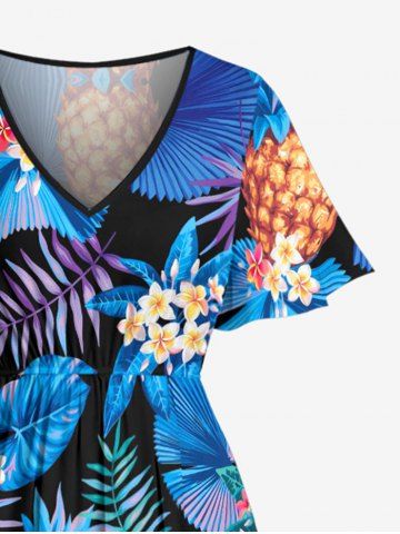 Plus Size Pineapple Flowers Tropical Leaf Print Split Hawaii Midi Dress - Blue - 3x