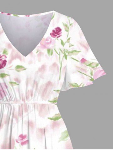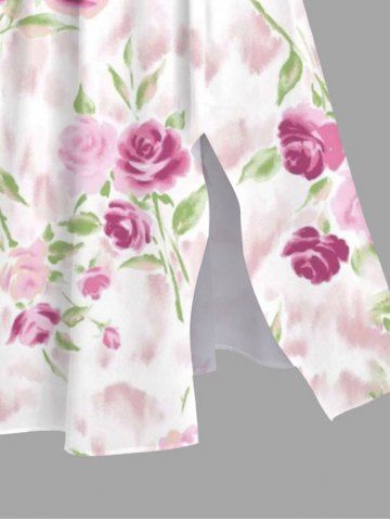 Plus Size Rose Flower Leaf Print Split Hawaii Midi Dress - White - M