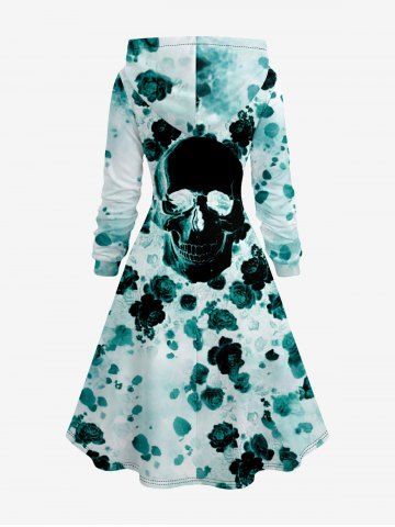 Plus Size Skull Rose Flower Print Lace Up Drawstring Hoodie Dress - Green - S