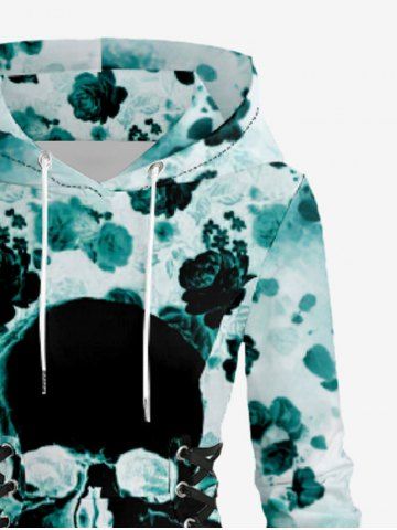 Plus Size Skull Rose Flower Print Lace Up Drawstring Hoodie Dress - Green - 4x