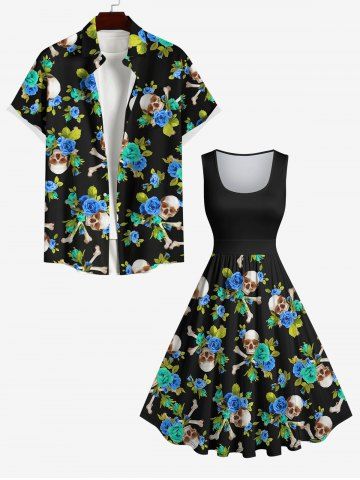 Plus Size Skulls Rose Flower Leaf Print 1950s Vnintage Dress - Black - 4x