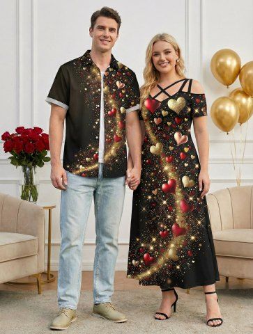 Valentine's Day Heart Star Glitter 3D Print Plus Size Matching Outfit For Couples - Black