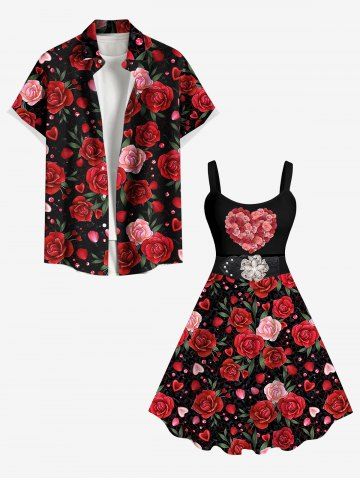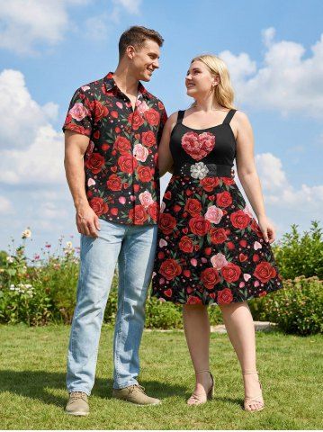 Valentine Couple Sets > Valentine's Day Rose Flowers Heart Print Plus Size Matching Outfit For Couples