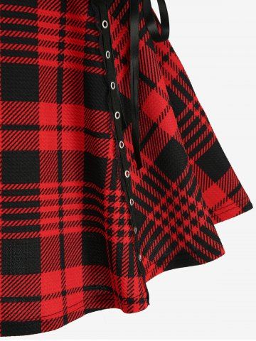 Plaid Print Ruched Grommets Lace-up Heart Buckle Lace Trim Tank Top - Red - L