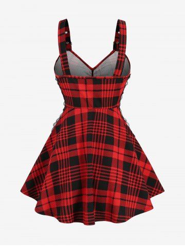 Plaid Print Ruched Grommets Lace-up Heart Buckle Lace Trim Tank Top - Red - Xxl