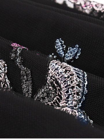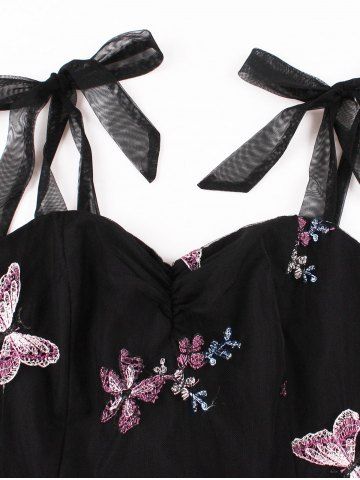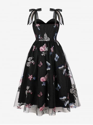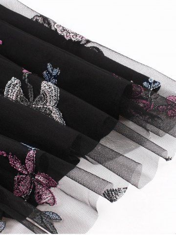 Butterfly Flower Embroidery Mesh Zipper Tie Bowknot Tank Vintage Dress - Black - M