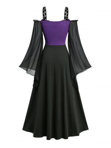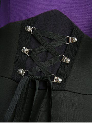 Chiffon Textured Sleeve Cold Shoulder Two Tone Patchwork Lace Up Vintage A Line Dress - Purple - S