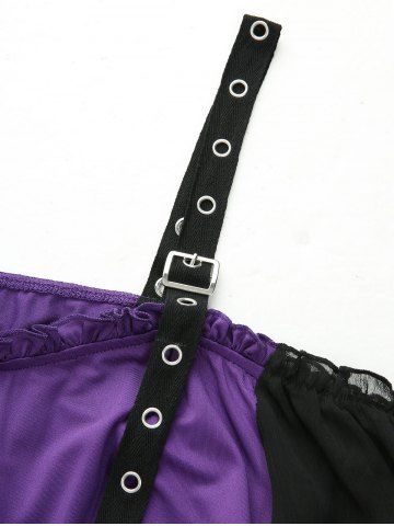 Chiffon Textured Sleeve Cold Shoulder Two Tone Patchwork Lace Up Vintage A Line Dress - Purple - Xl