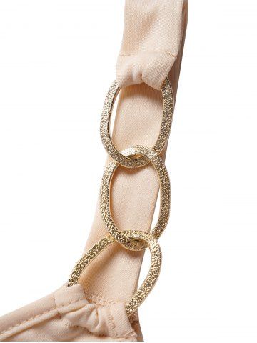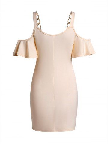 Cold Shoulder Ruched Mock Button Tulip Hem Surplice Plunge Mini Dress - Light Coffee - L