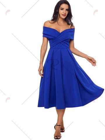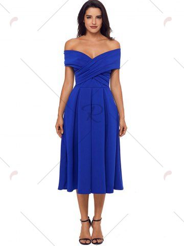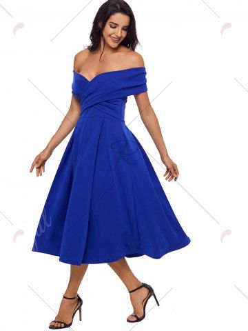 Cross Front Open Shoulder Prom Dress - Blue - L
