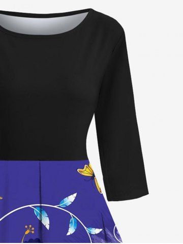 Curve Branch Floral Leaves Butterfly Paint Print Hawaii 50's Vintage Midi Dress - Blue - Xl