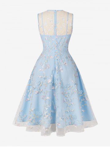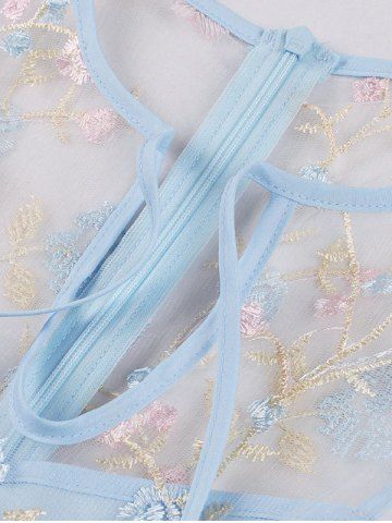 Floral Leaf Embroidery Mesh Patchwork Tied Keyhole Neck Zipper Vintage Dress - Blue - L