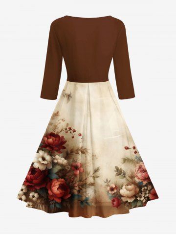 Flower Leaf Branch Print Hawaii Ombre 50's Vintage A Line Dress - Brown - 3xl