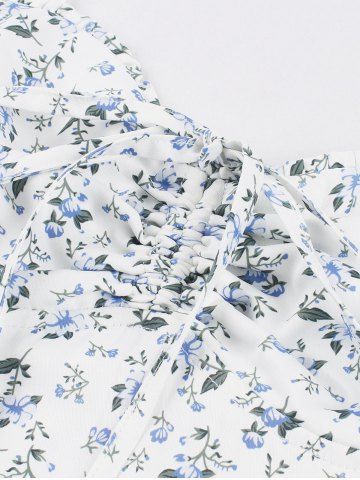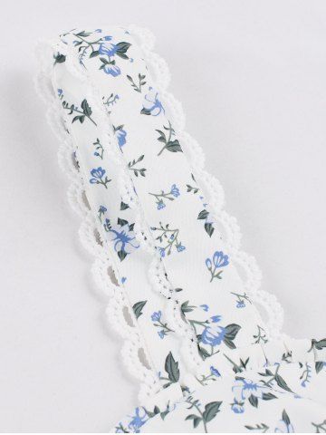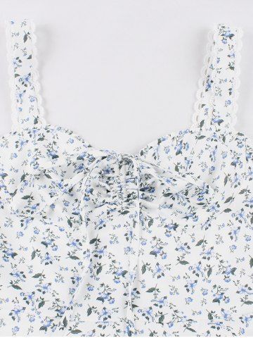 Flower Leaf Print Cinched Bowknot Lace Trim Tank Vintage Dress - Light Blue - M