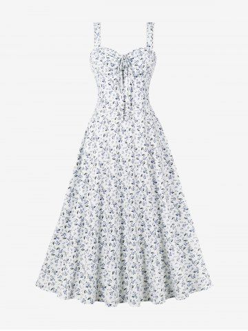 Vintage Dresses > Flower Leaf Print Cinched Bowknot Lace Trim Tank Vintage Dress