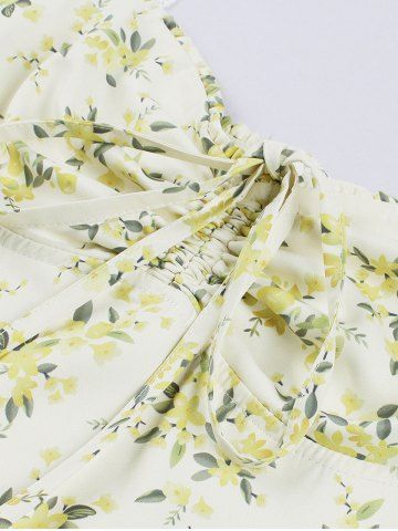 Flower Leaf Print Cinched Ruched Bowknot Lace Trim Tank Vintage Dress - Yellow - S