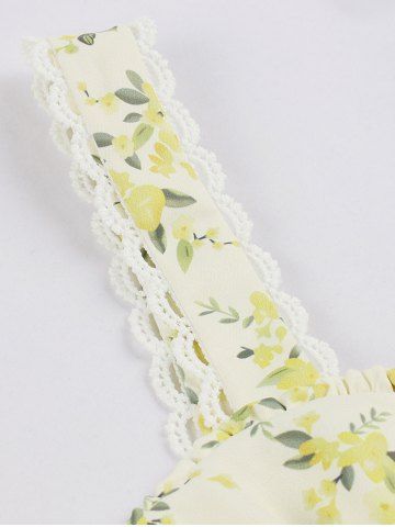 Flower Leaf Print Cinched Ruched Bowknot Lace Trim Tank Vintage Dress - Yellow - L