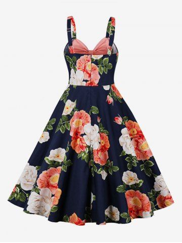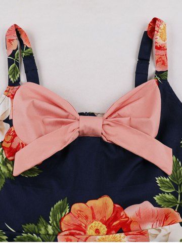 Flowers Leaf Print Tulip Hem Layered Bowknot Panel Tank Vintage Dress - Blue - M