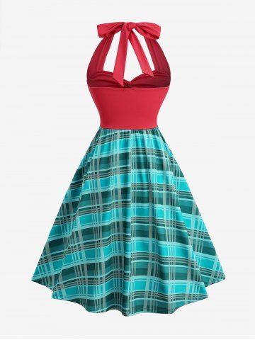 Vintage Dresses > Plaid Print Button Twist Ruched Halter Backless A Line Dress