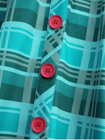 Plaid Print Button Twist Ruched Halter Backless A Line Dress - Green - M