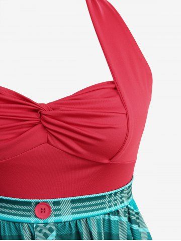 Vintage Dresses > Plaid Print Button Twist Ruched Halter Backless A Line Dress