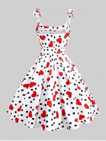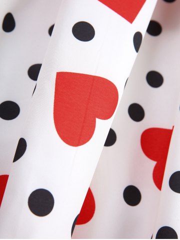 Plus Size Polka Dots Heart Print Pleated Tie Bowknot Vintage Dress With Belt - White - Xl