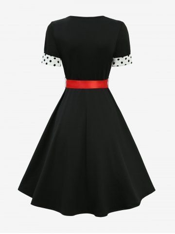 Polka Dot Printed Patchwork Vintage A Line Dress with Removable Tied Belt - Black - S