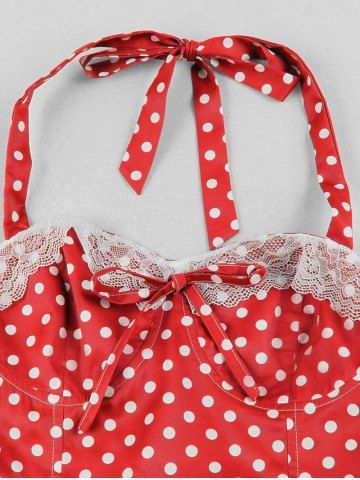 Polka Dots Print Floral Lace Trim Halter Bowknot Vintage Dress - Red - 2xl