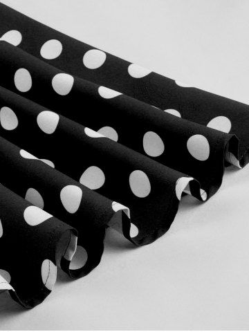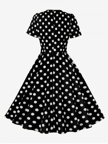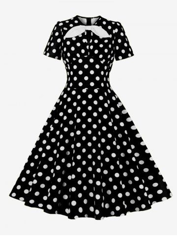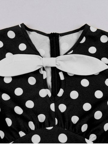 Polka Dots Print Ruched Keyhole Neck Bowknot Vintage Dress - Black - L