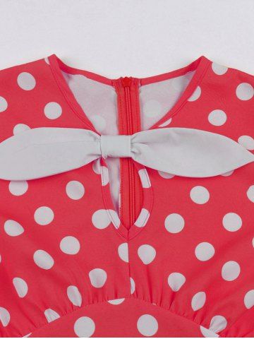 Polka Dots Print Ruched Keyhole Neck Bowknot Vintage Dress - Red - Xxl
