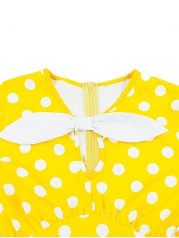 Polka Dots Print Ruched Keyhole Neck Bowknot Vintage Dress - Yellow - Xxl