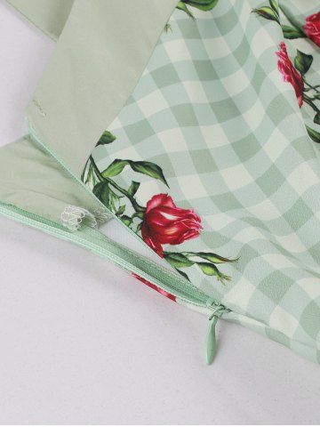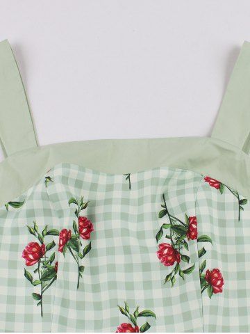 Rose Flowers Leaf Plaid Print Ruched Back Mesh Tank Vintage Dress - Green - Xxl