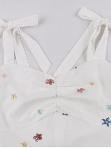 Star Embroidery Sparkling Sequin Mesh Tie Bowknot Ruched Vintage Dress - White - M