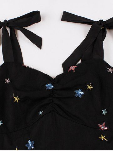 Star Embroidery Sparkling Sequin Mesh Tie Bowknot Ruched Vintage Dress - Black - L