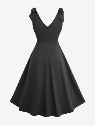 Tied Shoulder Surplice Solid Vintage A Line Dress - Black - Xxl