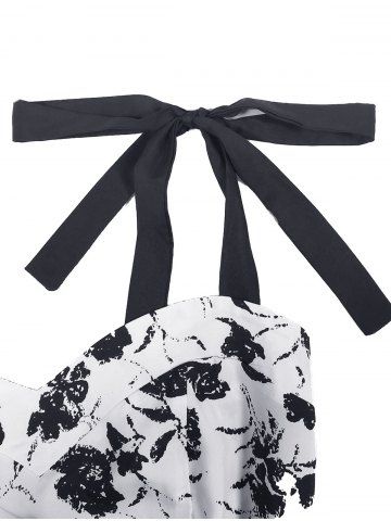 Two Tone Rose Flower Print Bowknot Tie Ruched Back Vintage Dress - White - Xl