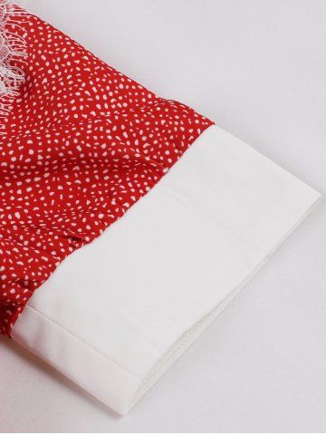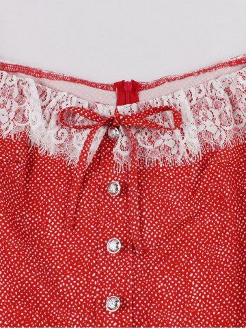 Bowknot Leaf Print Lace Trim Neck Tie Buttons Vintage Dress - Red - S
