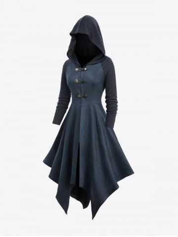 Cable Knit Patchwork Buckle Asymmetrical Hooded Coat - Deep Blue - Xxl