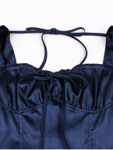 Cinched Ruched Lace Up Tie Solid Color Vintage Dress - Deep Blue - M