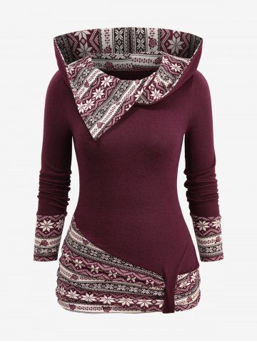 Ethnic Floral Print Ruched Asymmetrical Long Sleeves Hooded Top - Deep Red - Xxl