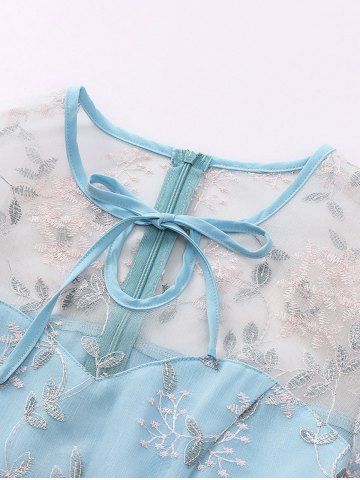 Flowers Leaves Embroidery Mesh Tie Zipper Keyhole Neck Vintage Dress - Blue - Xl