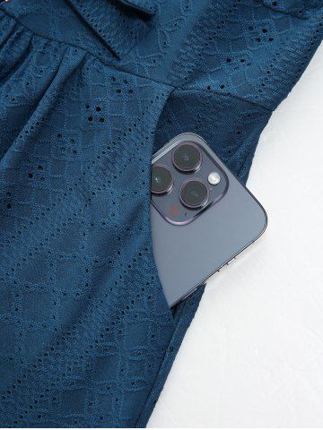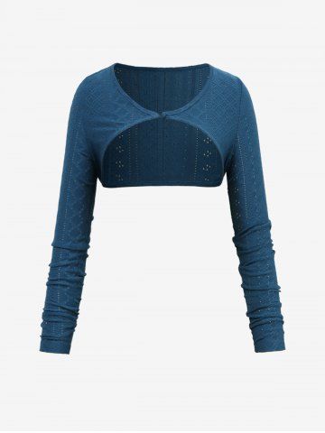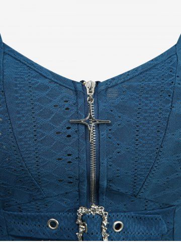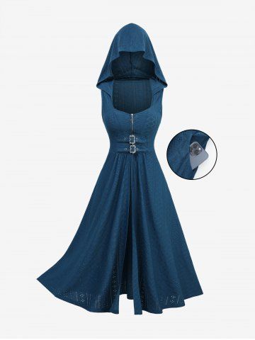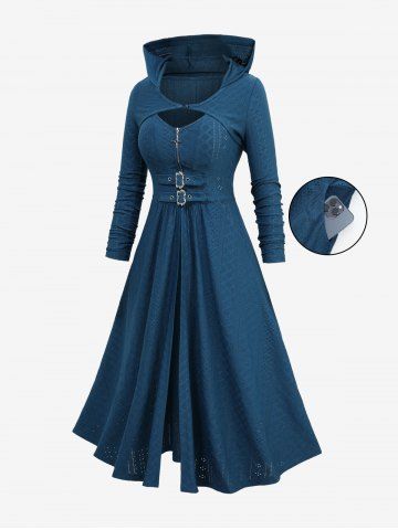 Hollow Out Jacquard Cross Zipper Buckle Split Hooded Coat With Shrug Top - Deep Blue - S