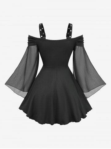 Lace Up Grommet Ruched Cold Shoulder Sheer Mesh Flare Sleeves Top - Black - M
