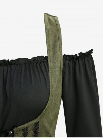 Lace-up Ruffles Ruched Lace Trim Flare Sleeves Cold Shoulder Dress - Deep Green - L