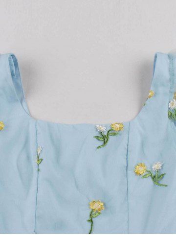 Square Neck Flowers Embroidery Mesh Long Sleeve Vintage Dress - Blue - Xl